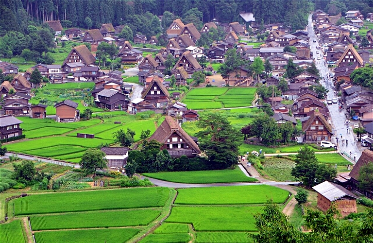 【白川鄉合掌村】地處豪雪地帶、再加上山區地形阻絕、形成地域獨特的風俗文化,至今仍完整保留為日常生活之用,其中以合掌型的茅草家屋最為著名。為防積雪而建構的急斜面的茅草屋頂,有如兩手合掌的形狀,目前尚有113棟,屋旁田地園圃交錯銜接,構成一幅濃厚懷古幽情、山間農村的田園景觀,於1995年12月聯合國文教組織登錄為世界遺產以來,世界各國的觀光客蜂擁而至。